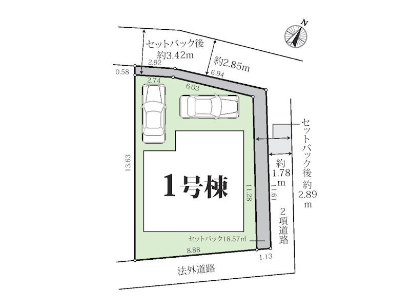 | 接道状況 | 接道: 北 公道 道路幅: 3.4m 接道: 東 公道 道路幅: 2.8m |